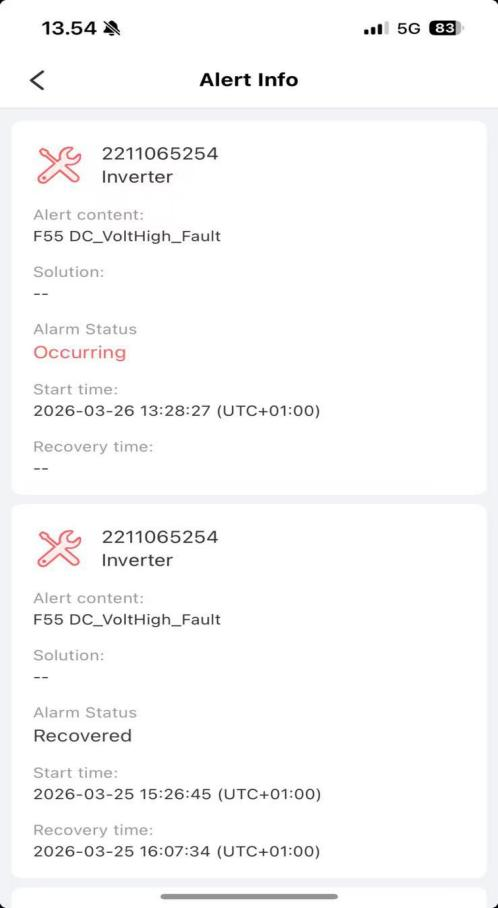 แพลตฟอร์มรายงาน F55 DC - โวลต์ สูง - ข้อผิดพลาดที่บ่งชี้ว่าบัส DC โอเวอร์ แรงดันไฟฟ้า ความผิดพลาดเกิดขึ้นในช่วงกลางวันที่สูง - ช่วงการฉายรังสีและชัดเจนโดยอัตโนมัติเมื่อการฉายรังสีตก รูปแบบที่ทำซ้ำจะตรงกับจังหวะเวลาแรงดันไฟฟ้าเกิน DC ทั่วไป