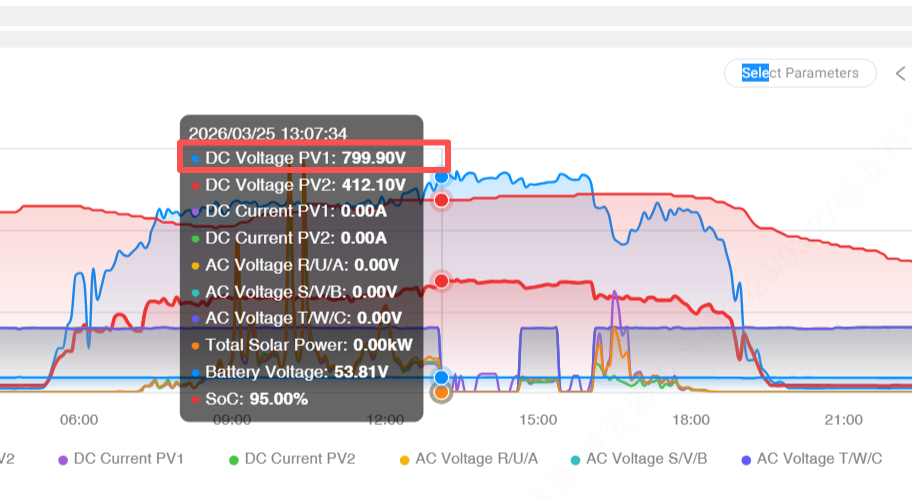 - สาเหตุหลัก: สตริง PV1 มีโมดูลมากเกินไปในอนุกรม ส่งผลให้แรงดันไฟฟ้าวงจรเปิดเกินอินเวอร์เตอร์อย่างมาก ' ขีดจำกัดอินพุต MPPT หรือ DC ภาพหน้าจอแสดง 799.90 V ซึ่งเกินขีดจำกัดความปลอดภัยทั่วไปมาก